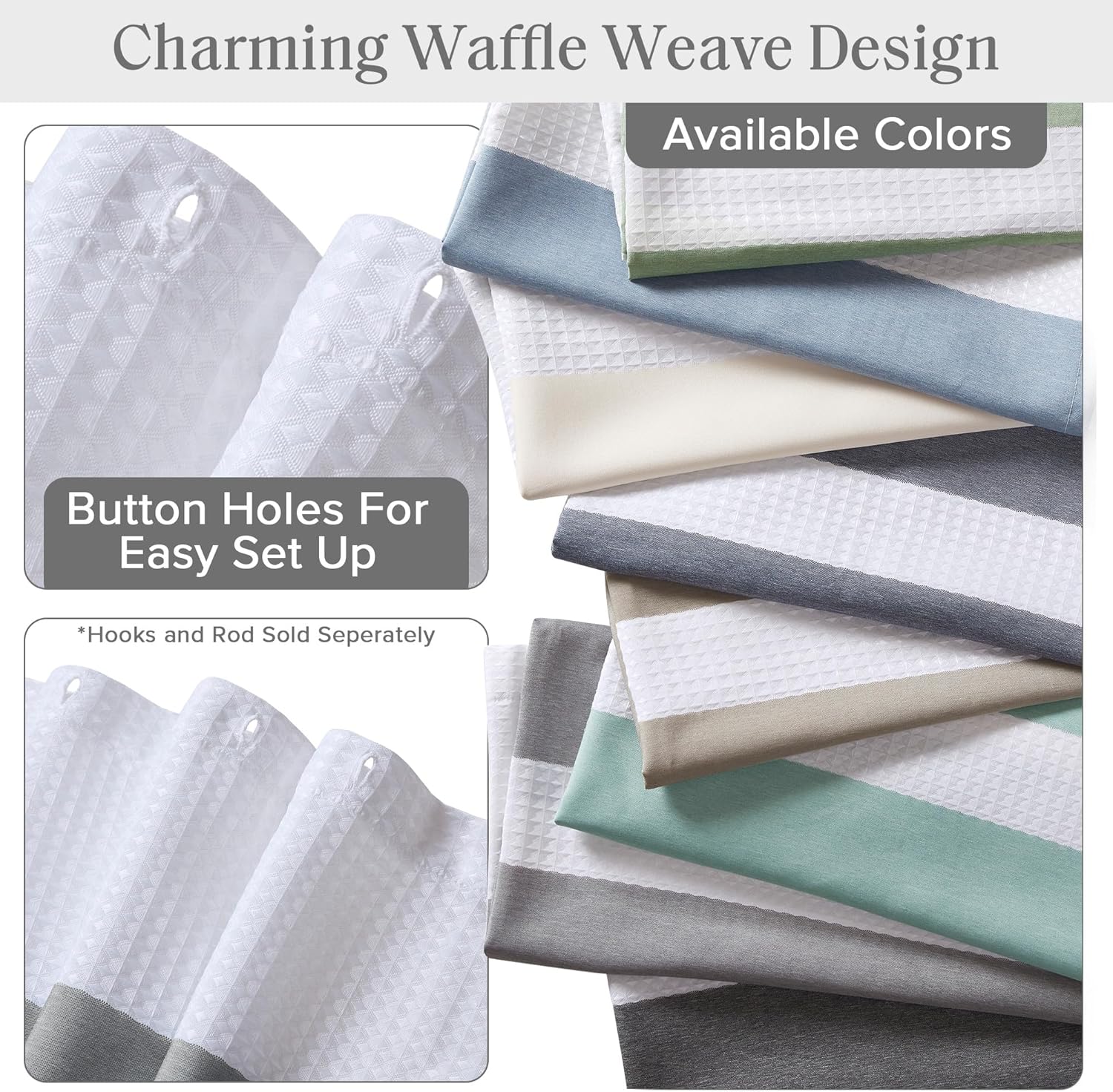 Update your space with the Madison Park Spa Waffle Shower Curtain with 3M Treatment. Featuring a fresh and updated stripe design, this shower curtain is made of a light heathered colored fabric pieced with a white waffle weave base creating a beautiful texture for the perfect spa touch to your decor. A temporary 3M Scotchgard Moisture Managementkeeps your curtain looking newer, longer and is active for multiple washes. A waterproof liner is not included but still highly recommended to keep this shower curtain in its best condition; Hooks and Rod also not included and should be purchased separately. Various colors and sizes are available to fit any bathroom space. Size shown in image is standard 72x72", stripe design may vary per all other sizes. Complete the collection with coordinate Spa Waffle Bath Towel and Spa Cotton Bath Rug, available and sold separately.