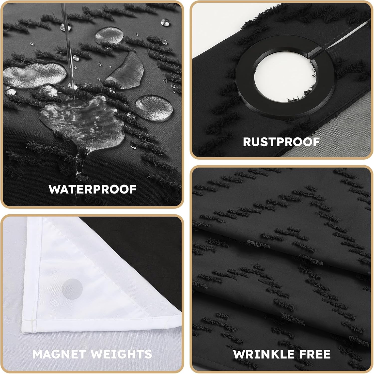 No Hook Shower Curtain and Liner Set, Black Snap in Shower Curtain Ringless Chevron Tufted Cloth Waterproof Washable Fabric Bath Curtain with See Through Top Window for Bathroom Hotel 71" x 74"